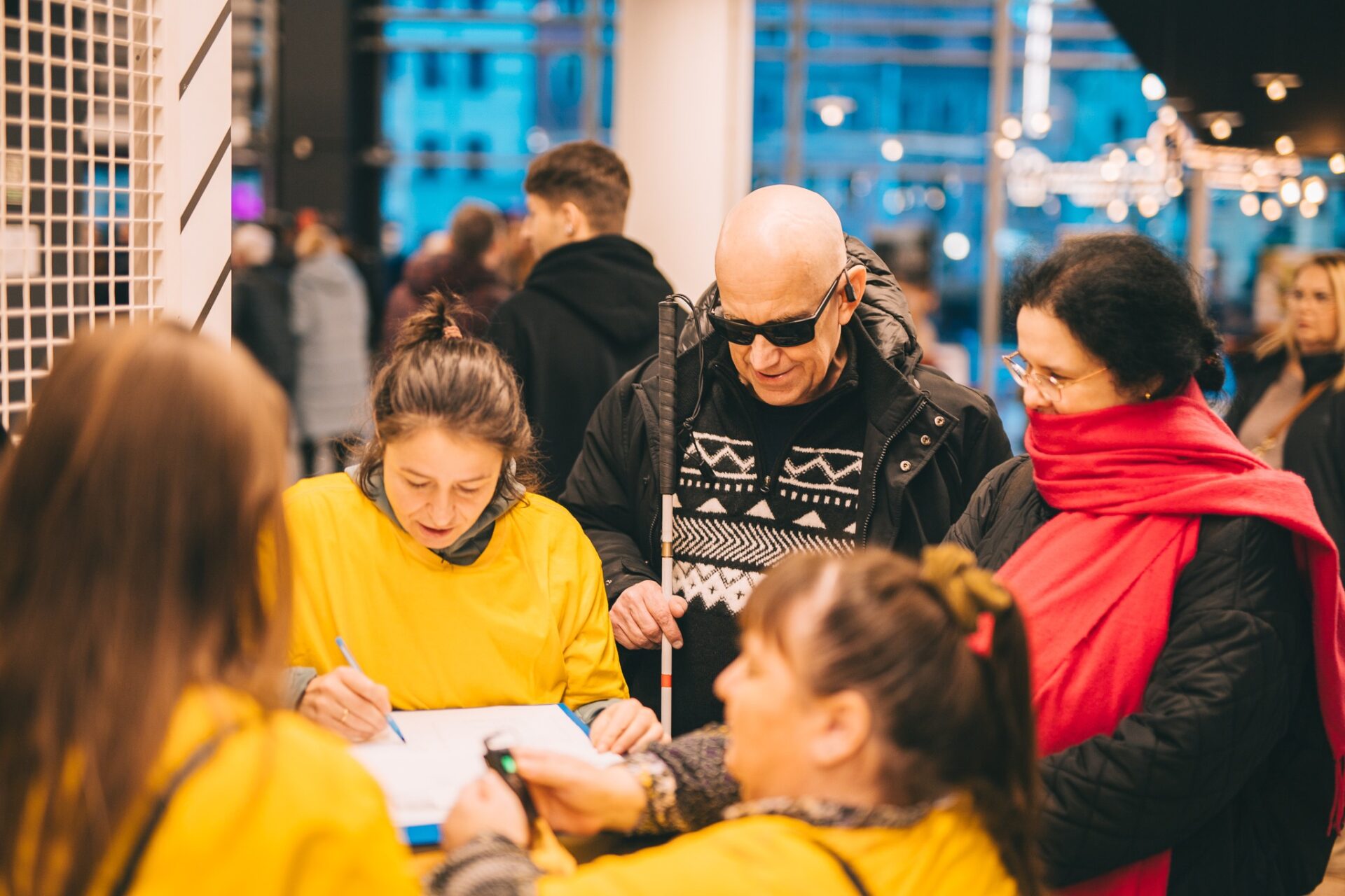 Mężczyzna w ciemnych okularach i z białą laską stoi obok kilku kobiet w żółtych koszulkach. Zapisują coś na kartce. W tle rozmazana grupa osób na korytarzu w kinie.