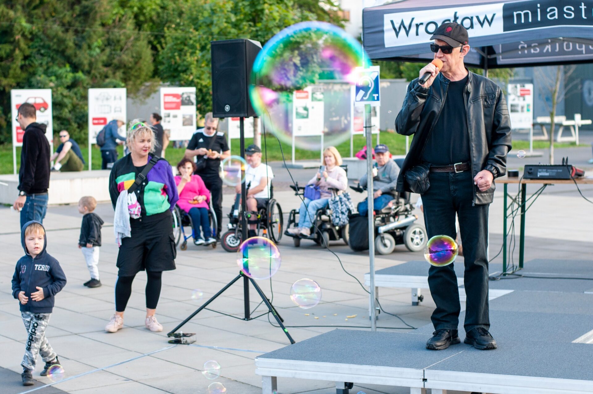 Na niewielkiej scenie stoi mężczyzna w czarnych ubraniach i ciemnych okularach. Wokół zgromadzeni są dorośli i dzieci. W ręce trzyma mikrofon. W powietrzu unoszą się bańki mydlane. Świeci słońce, jest pogodnie.