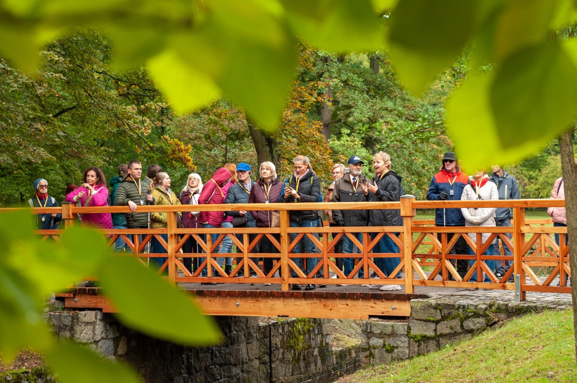 Zdjęcie drewnianego mostu, na którym stoi tłum osób. Mają na szyjach zawieszone odbiorniki do audiodeksprycji. W tle jesienna pogoda. W rogach zdjęcia liście, które tworzą ramkę.