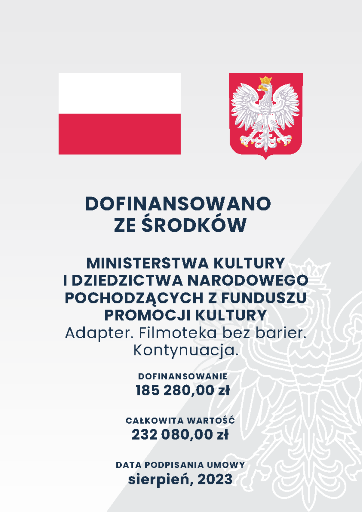 Zadanie polega na dalszym rozwoju portalu www.adapter.pl. W latach 2023-2025 zostanie opracowanych, dostosowanych i udostępnionych kolejne 42 filmy (fabuły, dokumenty, krótkie i długie metraże, animacje) – z audiodeskrypcją, napisami dla niesłyszących lub tłumaczeniem migowym; 54 fotosy filmowe/plakaty z audiodeskrypcją. Materiały to zasoby Filmoteki Narodowej, Wytwórni Filmów Dokumentalnych i Fabularnych lub innych studiów filmowych (tj. Kino Świat, Monolith, Szkoła Filmowa Wajdy). Oprócz materiałów z zasobów polskiej kinematografii, chcemy także udostępnić 24 polskie filmy z zakresu edukacji historycznej (dokumenty, animacje, fabuły). Dodatkowo planujemy zamieszczenie materiałów edukacyjnych: 36 audiowstępów (dla niewidomych odbiorców). Kolejne materiały będą udostępniane według harmonogramu kanału ADAPTER, na którym filmy i materiały pojawiają się w czwartki o godz. 20:00.